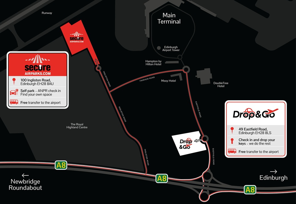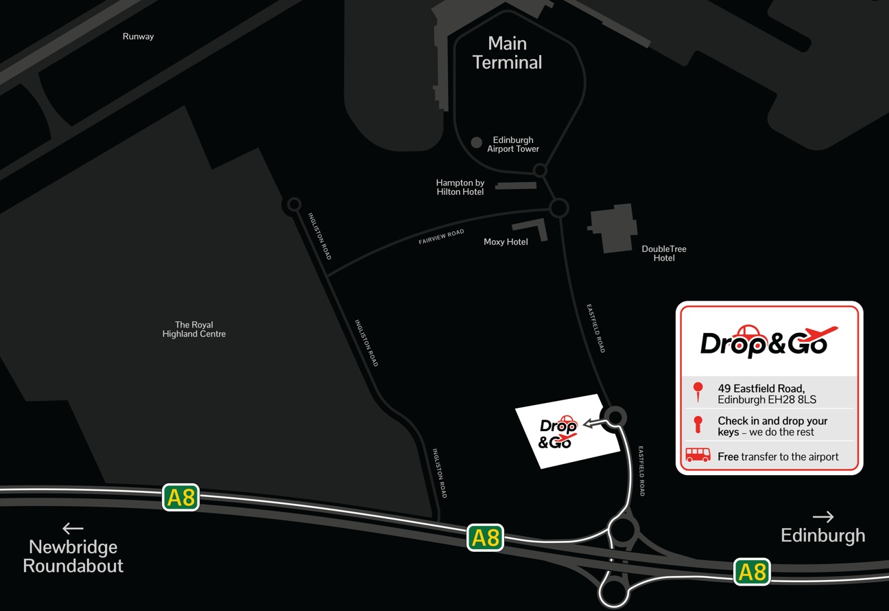 Drop & Go Started 2024 In April 2024 we opened up our Drop & Go product. Customers can just park in the drop and go lane and leave car keys and we will do the rest! Jump on our bus for a short journey to the airport and then when returning from your journey your car will be waiting for you in our derparture bay close to where you left the car! No need to find a space we do it all for you. This service from 23rd April 2025 is based at Drop & Go Parking, 49 Eastfield Road, Edinburgh, EH28 8LS.